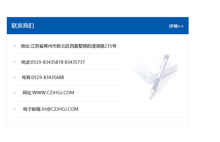 地址:常州市新北區友邦商務大廈1幢16、17層  電話:0519-85101652  傳真:0519-85112595  郵編:213022  網址:www_cz-jiayue_cn.dmkqzj.com  郵箱:xiajifengaa@163.com